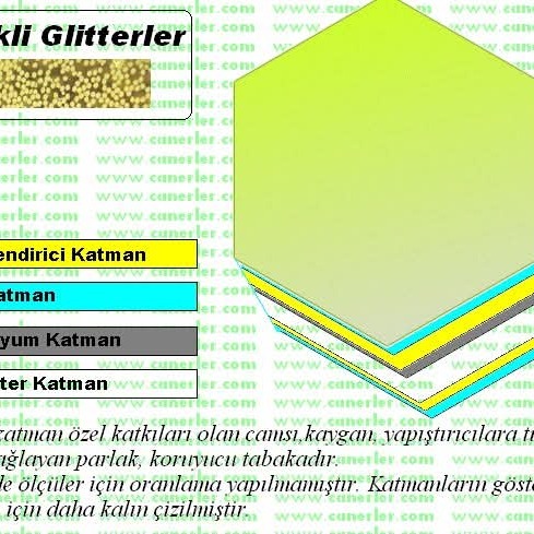 Özellik ve Açıklamalar:    Tekstil baskılarında kullanışlı ve uygun fiyatlı, daha az miktar kullanımda bile üstün kaplama sağlayan, Baskı şablonlarında 40 mesh lik şablon ile iyi netice veren daha güzel parlayan glitterdir.